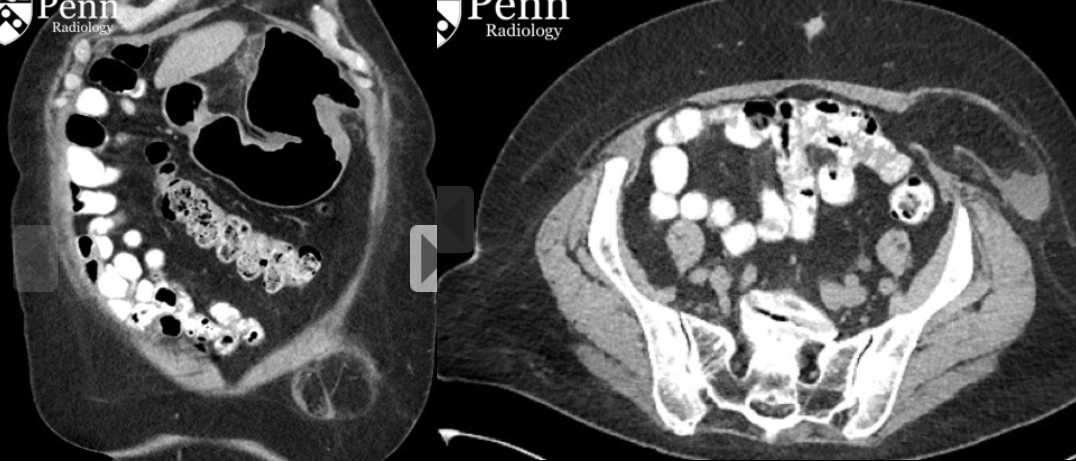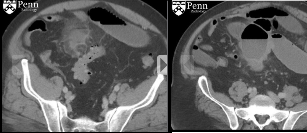 Sinal do mesentério enevoado: densificação da gordura com formação de uma pseudocápsula; poupa a gordura ao redor dos vasos do mesentério; pode ter linfonodos mesentéricos aumentados;