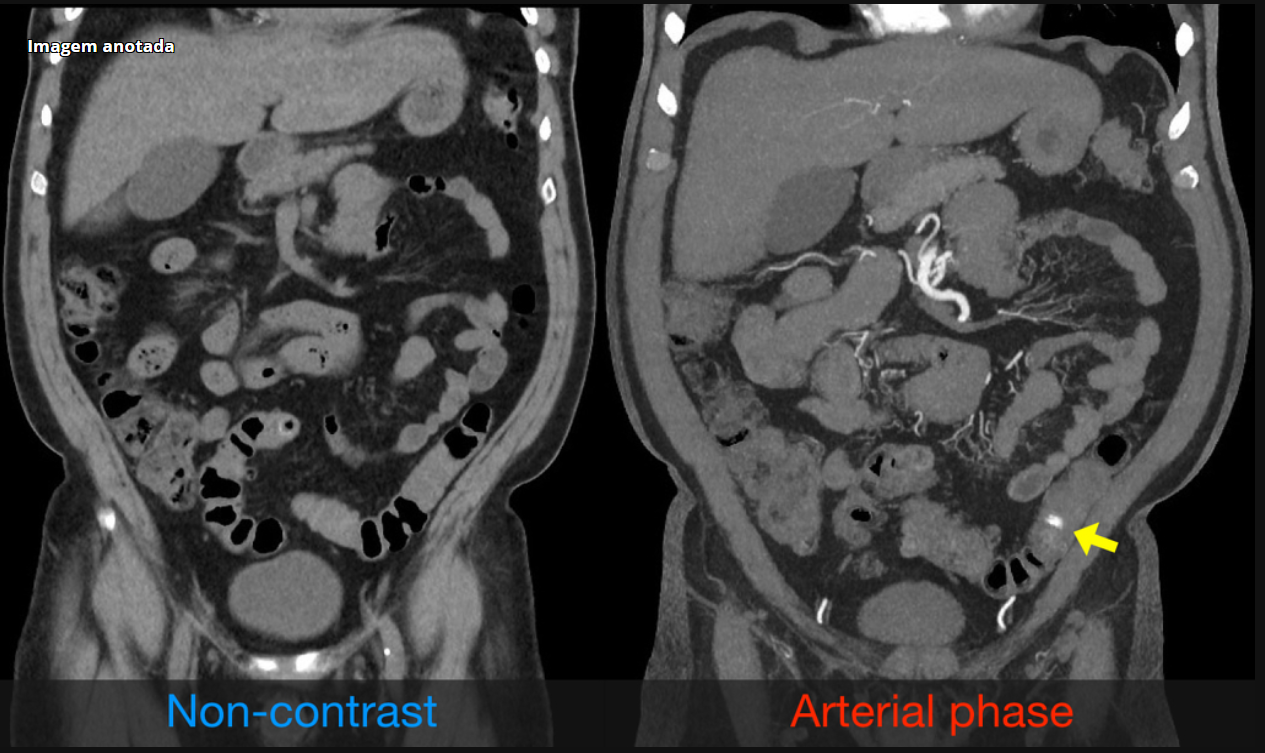 É notado um extravasamento de contraste para o interior do lúmen do colon durante a fase arterial.