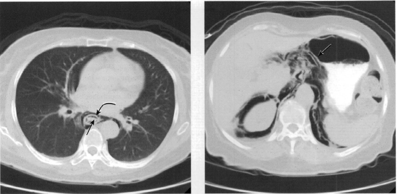 Extensa quantidade de ar no mediastino e no interior da parede do esôfago (em topografia da submucosa, entre a mucosa e a muscular);