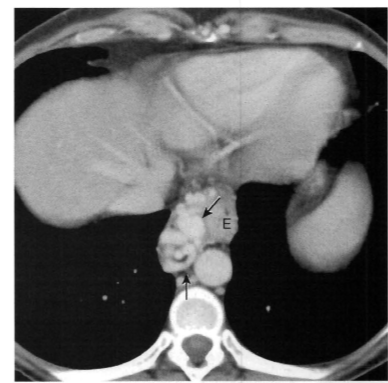 Multiplas imagens tubulares contrastantes, de densidade semelhante à aorta adjacente, ao lado do esôfago.