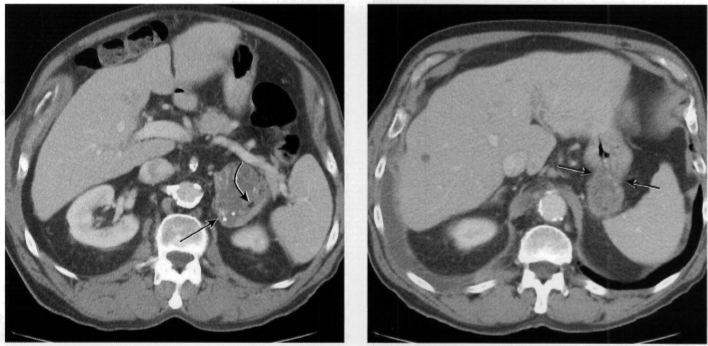 TC: Massa grande, na parede, podendo ser endoluminal ou exofítica, com densidade de partes moles, homogênea (< 3 cm) ou com centro necrosado (quando grandes), com realce periférico; podem apresentar uma cratera ulcerosa, que é preenchida por contraste oral e pode formar nível dentro dela.