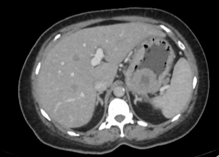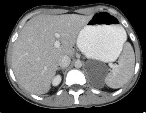 Massa de limites bem definidos, de conteúdo homogêneo com densidade de líquido (20 - 30 UH), sem comunicação com a luz do estômago, porém em íntimo contato com sua parede.
