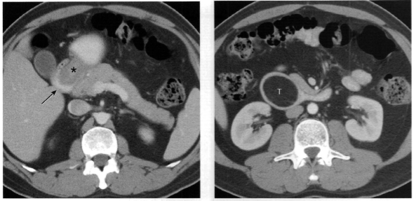 TC: Cisto com densidade de líquido, margens bem definidas que podem realçar com contraste; podem complicar com hemorragia, infecção: nível liquido, espessamento parietal.