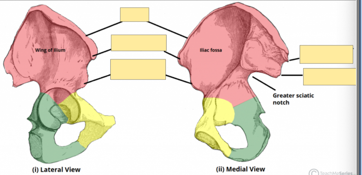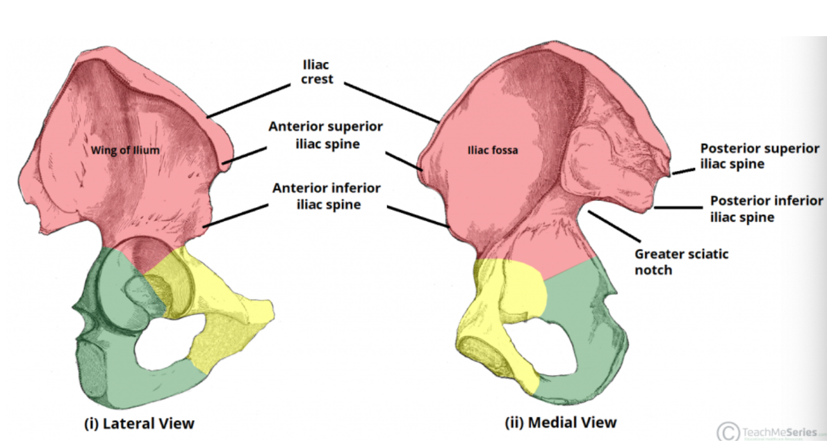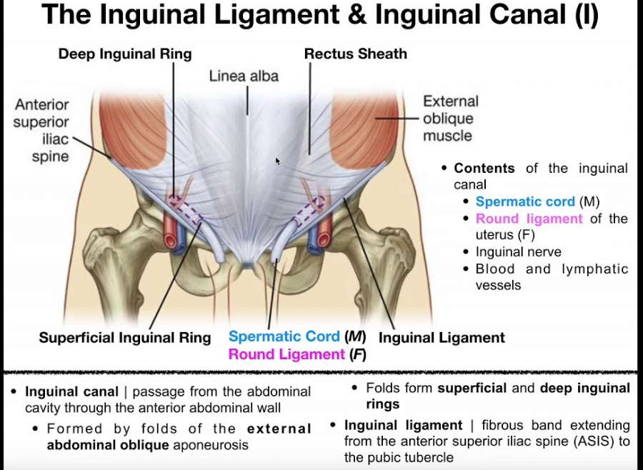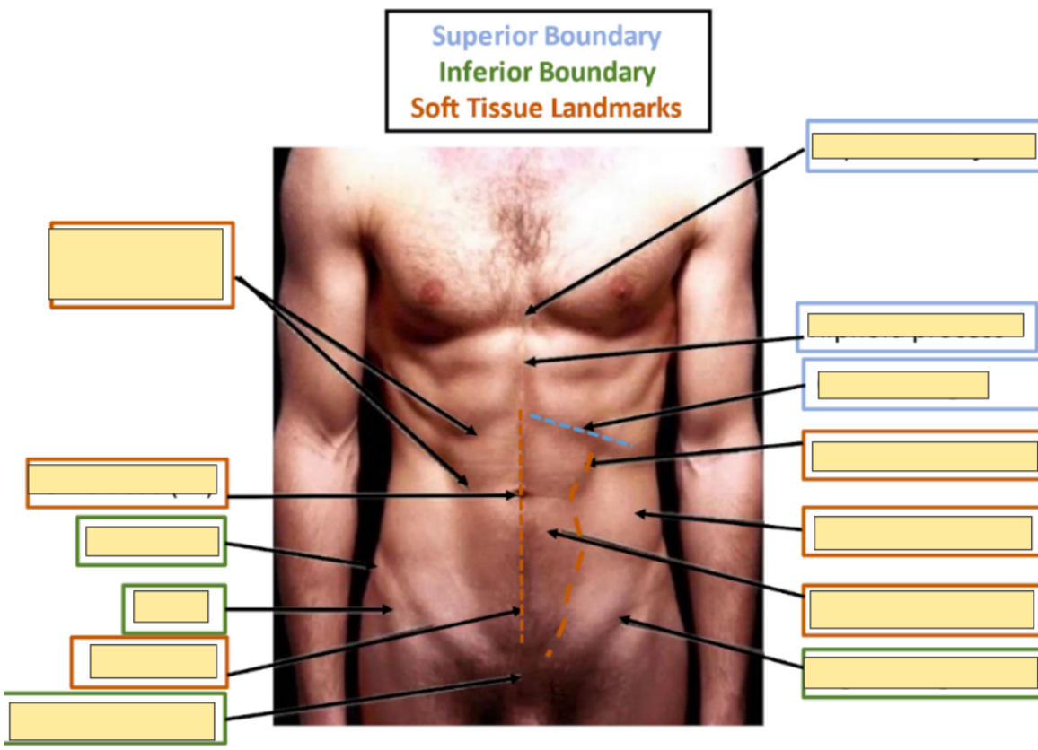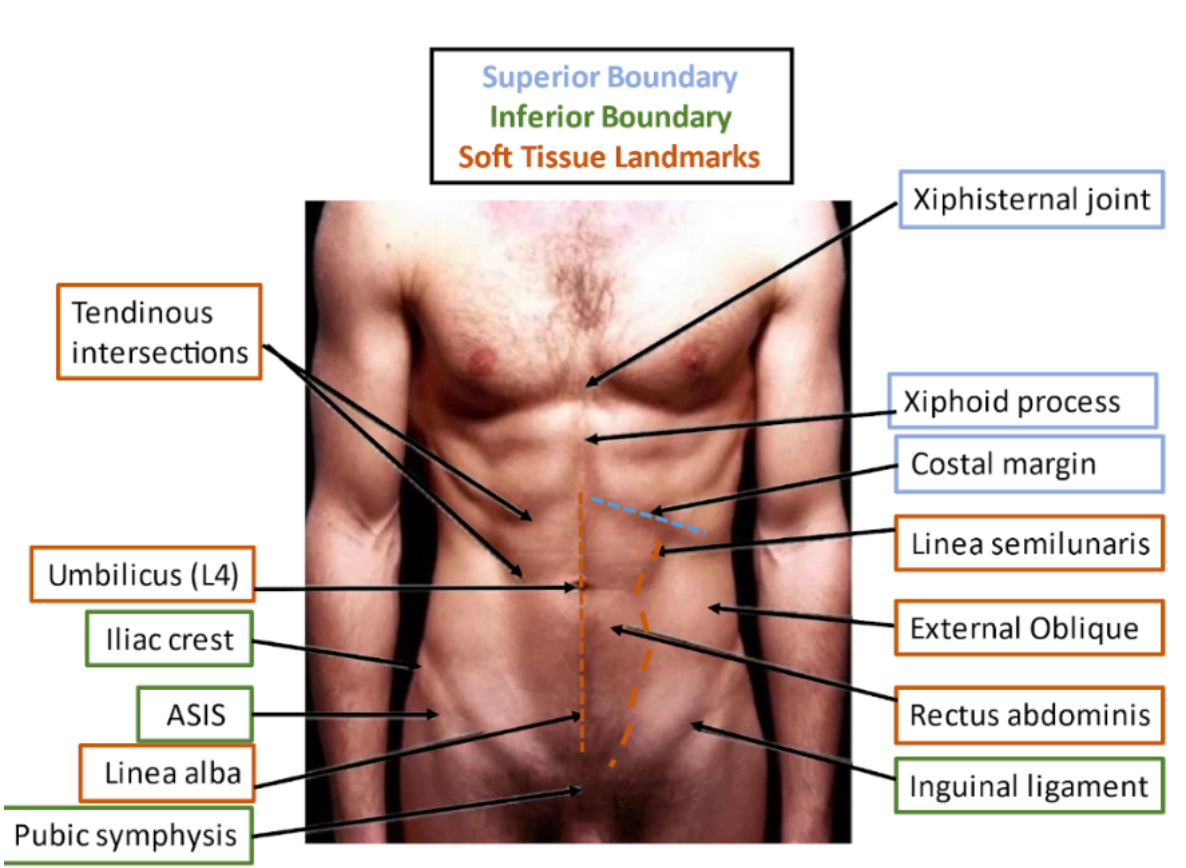 Inferior boundary = pubic symphysis; inguinal ligament and iliac crest