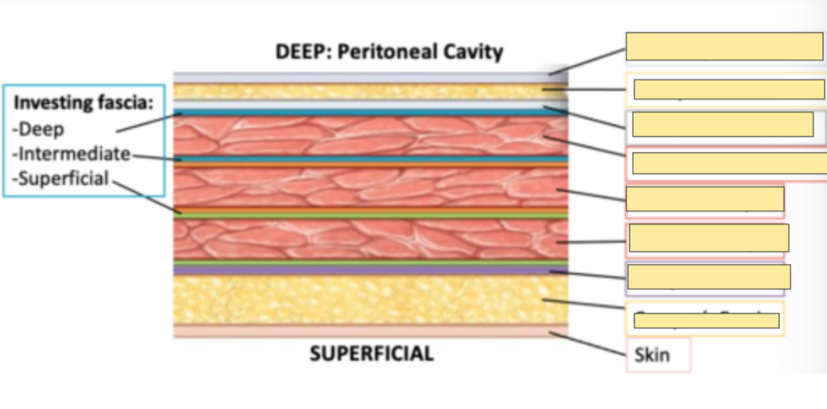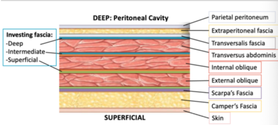 Scarpa’s Fascia – membranous (composed of elastic and connective tissue) and continuous with the fascia lata of the thigh; superficial ligaments of the penis; colles’ fascia and the perineum and labia majora