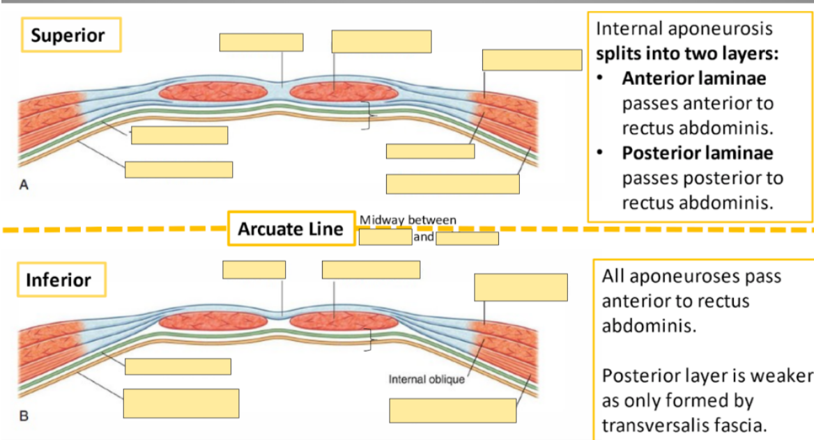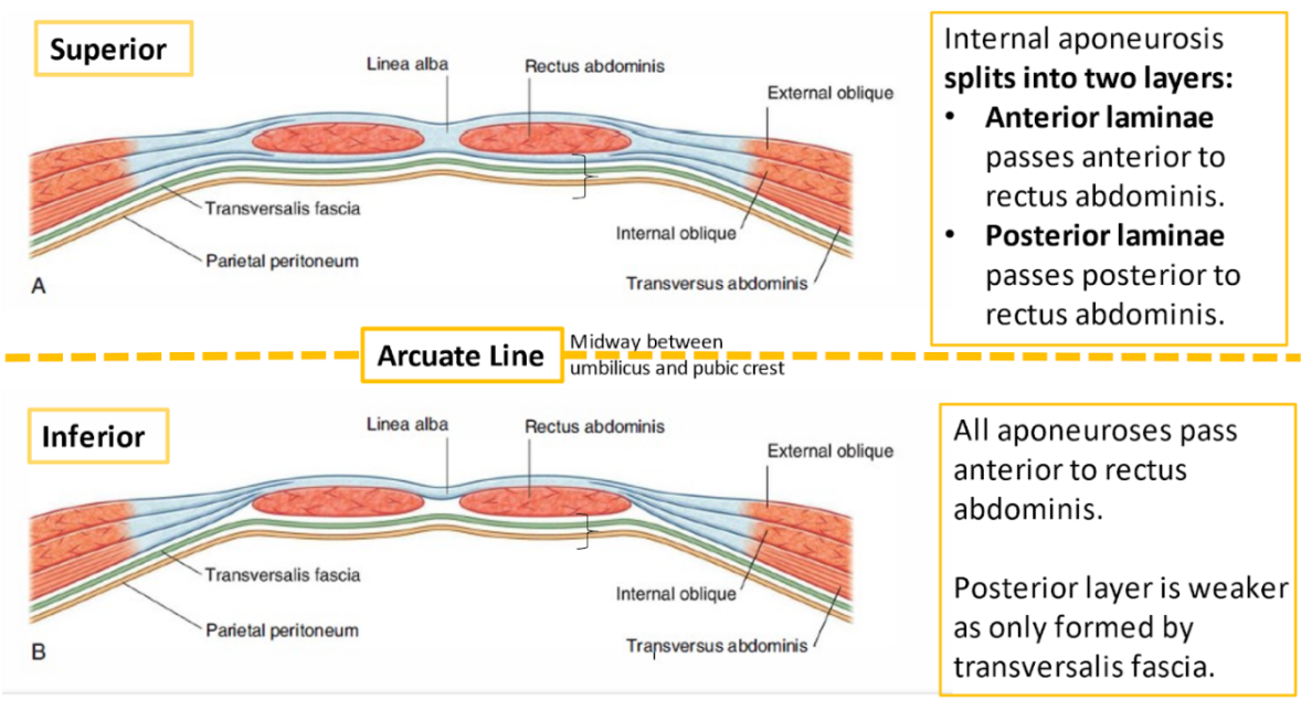 inferior: all aponeurosis pass anterior to rectus abdominis muscle, and weaker as only formed by transversalis fascia and parietal peritoneum in posterior side