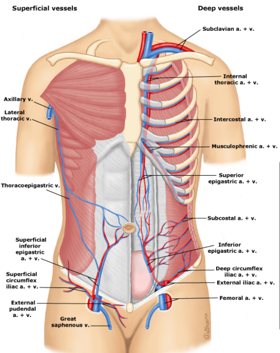 The musculophrenic artery, deep circumflex iliac artery, and subcostal arteries supply the lateral abdominal wall. The superficial epigastric veins and the superficial ili