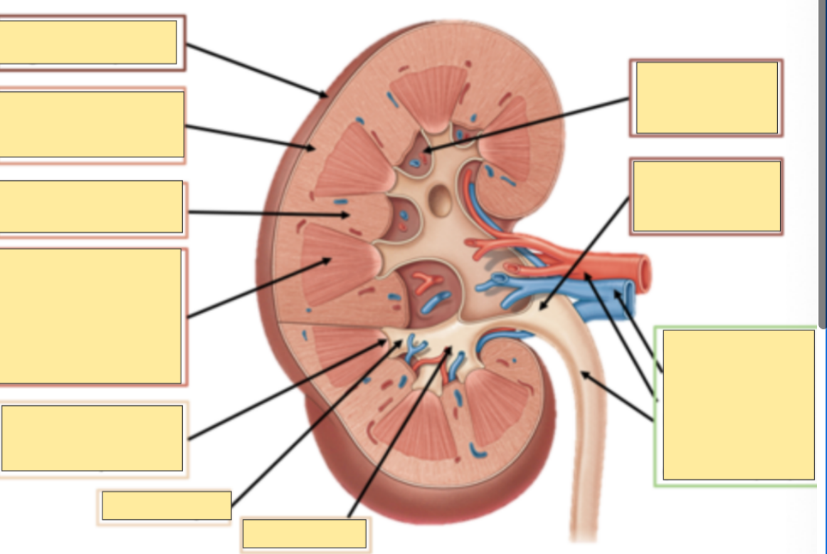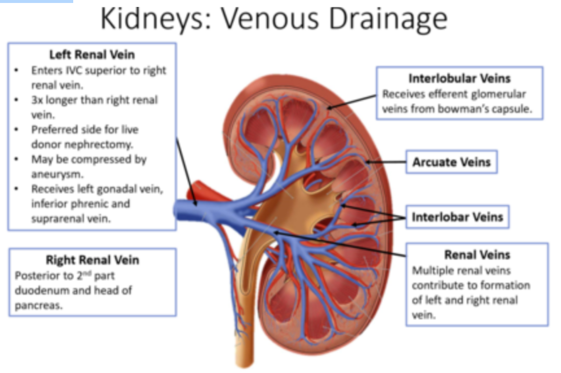 efferent glomelular veins –> interlobular –> arcuate –> interlobar –> renal veins –> L + R renal vein