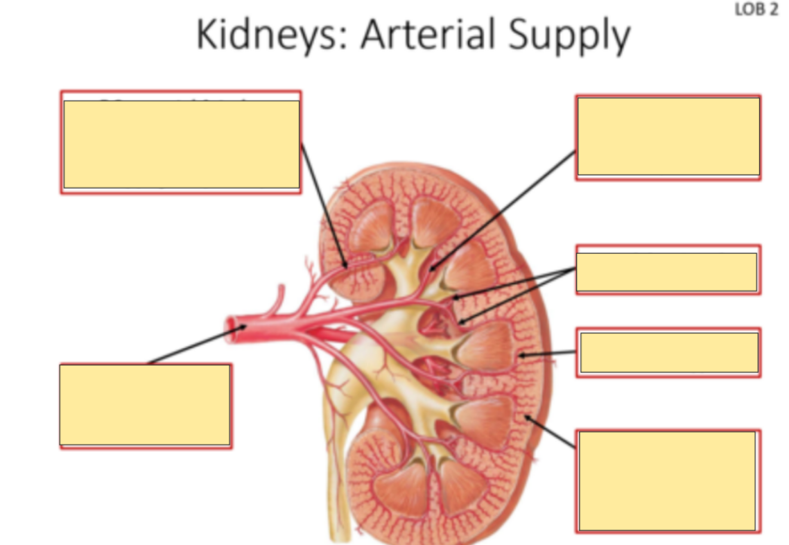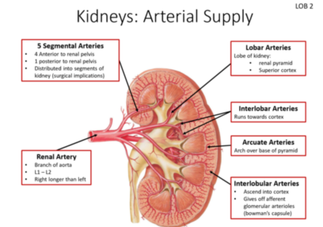 Abdominal aorta —> Renal arteries —> Segmental arteries —> Lobar arteries —> Interlobar arteries —> Arcuate arteries —> Interlobular arteries