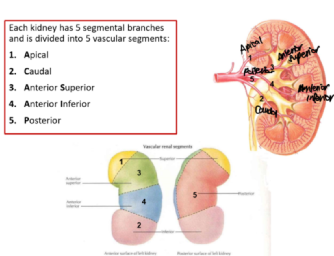 The segmental arteries of the kidneys will divide the kidney into 5 vascular segments