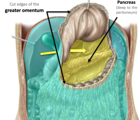 * greater sac = main compartment * lesser sac = hidden from view