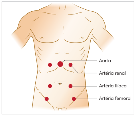 Quais são os focos de ausculta de vasos abdominais? Com qual parte do estetoscópio?