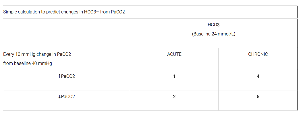 Expected PaCO2= 1.5x bicarb + 8 (+/- 2)