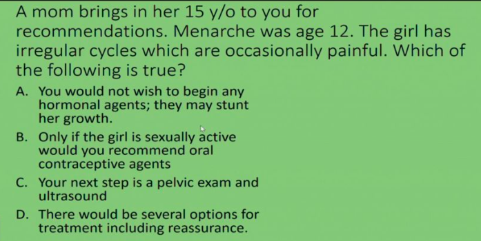 Reassure her that everything is fine, she will not need an exam typically, and that her body is adjusting to puberty. In these pts. the body is making plenty of estrogen but not enough progesterone yet so if the situation requires treatment, oral contraceptives or course of cyclic progesterone. (all in attempt in reproduce normal cycle)