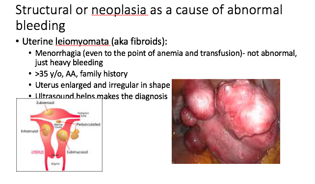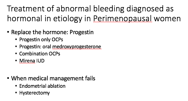 Again, like adolescent girls, these women are entering an anovulatory phase where the absence of the corpus luteum will prevent adeuqate porduction of progesterone causing the endometrium to slough more frequently/irregularly. Thus, if the diagnosis of anovulatory bleeding is made, the pt should be reassured or started on solo progesterin (or a low dose oral contraceptive).