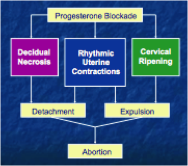 Binds progesterone receptor with high affinity causing abortion (competitive inhib) in 4-6 hours. It is 93-98% effective, req at least 2 provider visits and is approved by the FDA