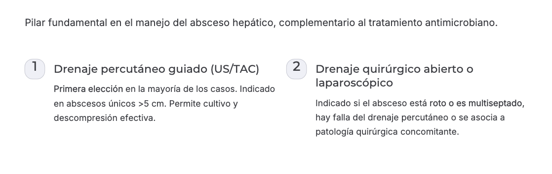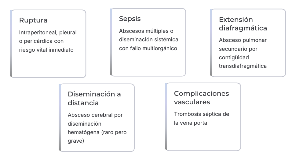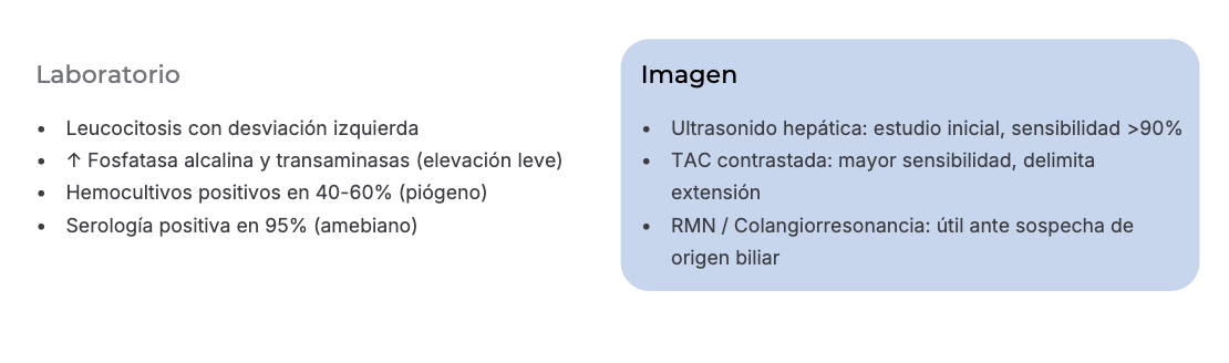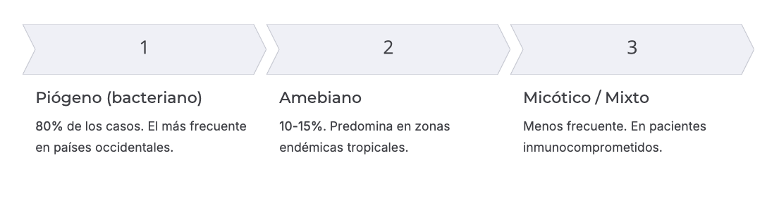 Colecciones purulentas o necróticas dentro del parénquima hepático, secundarias a infección bacteriana, parasitaria o fúngica