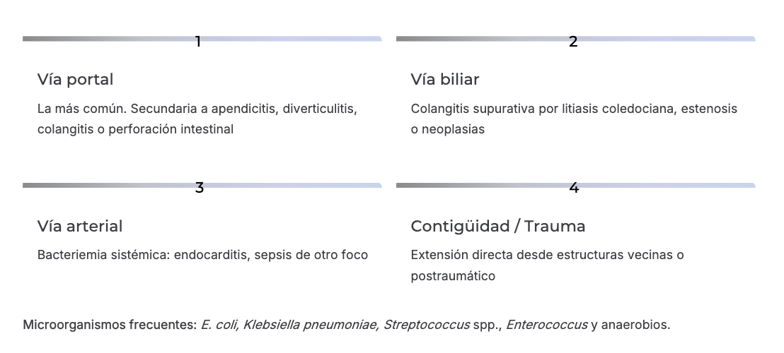 Vía portal es la más común: sobretodo pacientes con antecedente de infección previa como apendicitis, diverticulitis, colangitis, perforación intestinal