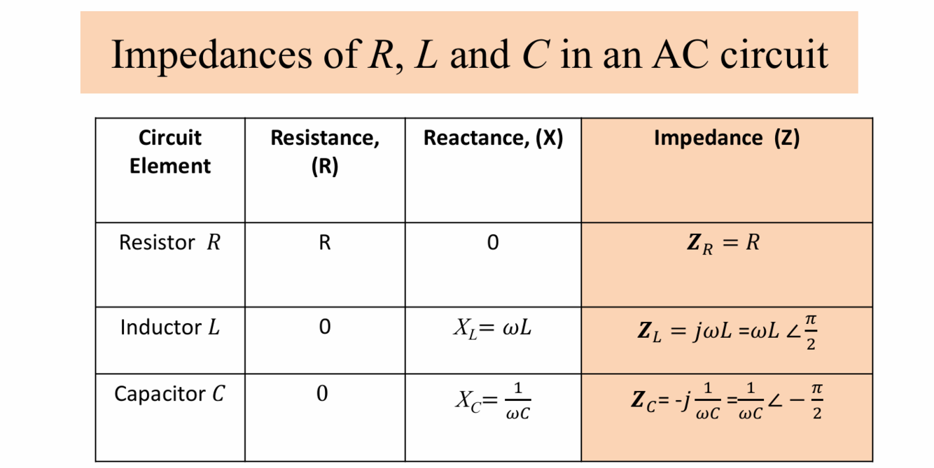 What are the equations for resistance, R, reactance, X, and impedance, Z, for a resistor, inductor and capacitor?