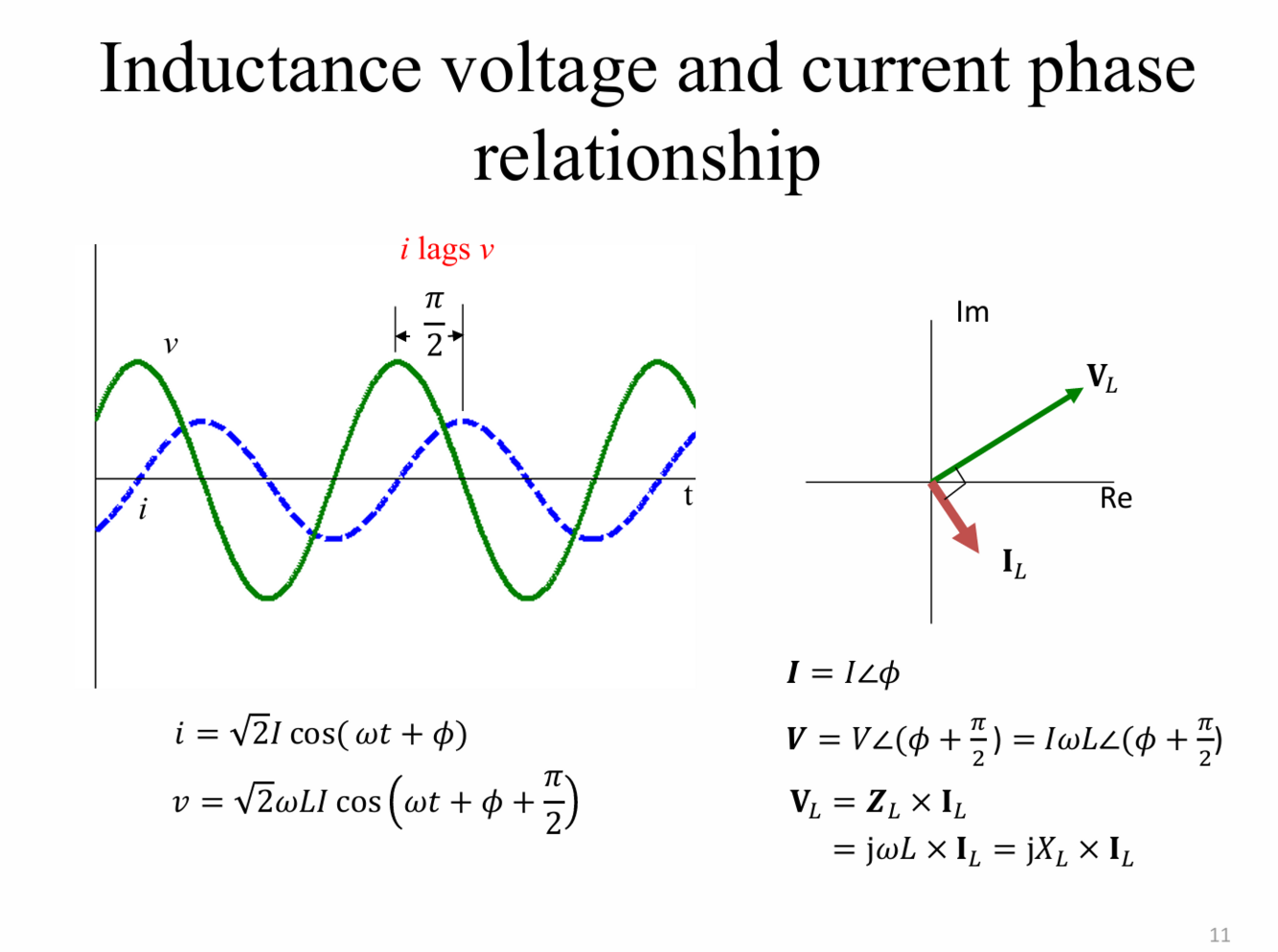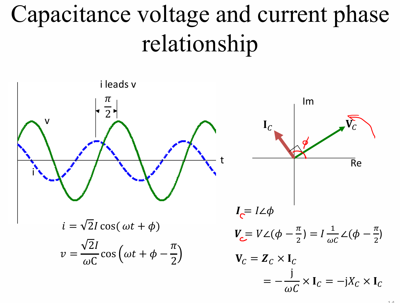 Current lags voltage by 90 degrees or pi/2. Remember CIVIL