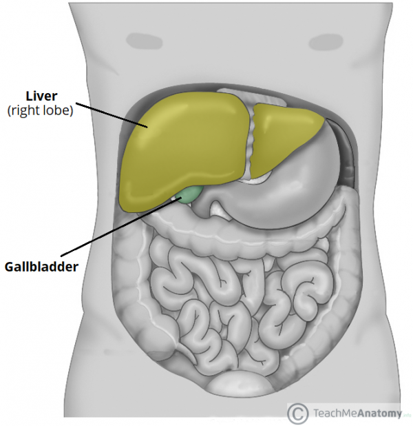 It is an intra-peritoneal, pear-shaped structure that lies between the inferior aspects of the right and quadrate lobes of the liver.