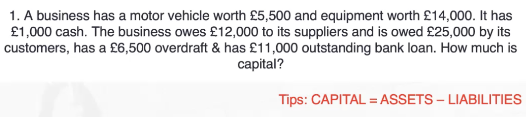 assets= what the business has. It has a van, £3000 worth of stock is hasn’t paid for yet or sold, and £4000 cash left over from buying the van.