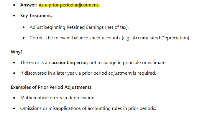 How is the correction of a mathematical error in prior years’ depreciation recorded?