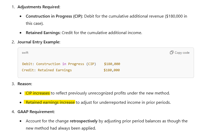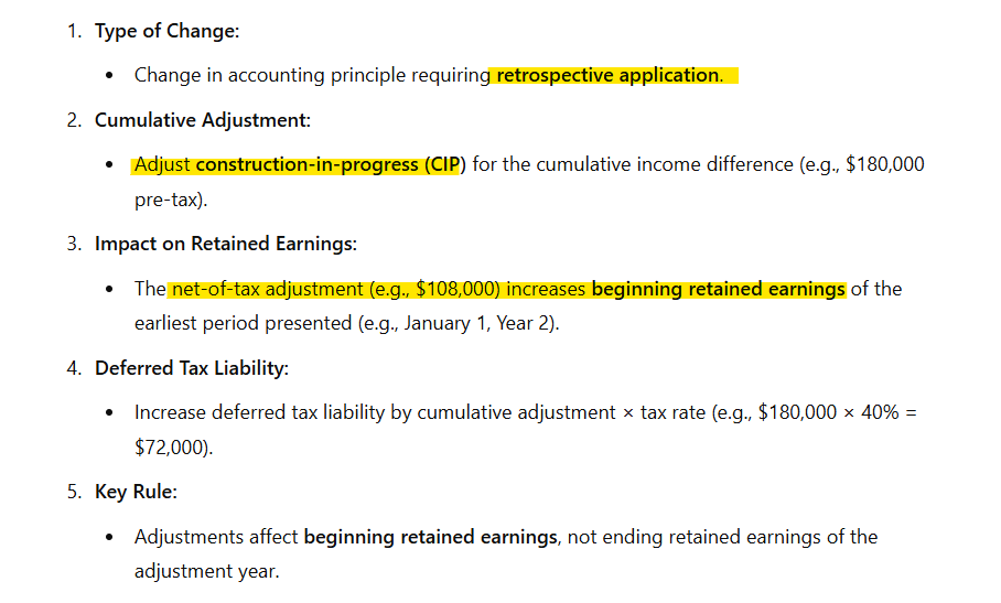 How is a change in revenue recognition for long-term construction contracts from a point in time to over time accounted for?