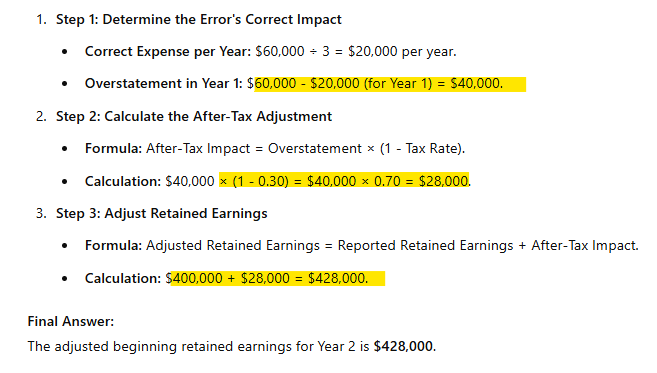 What are the steps to adjust beginning retained earnings for a prior-period error involving over-expensed amounts? Say 60k was recognized lump sum when it should have been over a 3y period