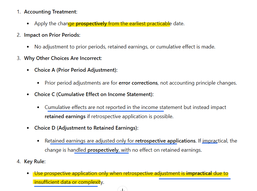 How is an accounting change handled when retrospective application is impracticable, and why are other treatments incorrect