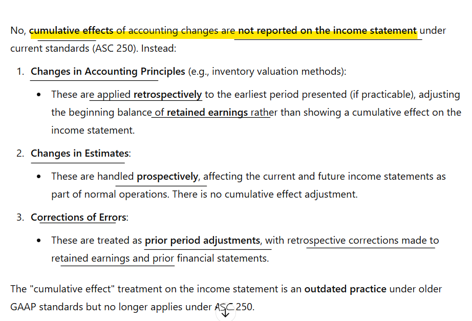 How is the cumulative effect of a change from LIFO to FIFO reported in the financial statements under ASC 250?