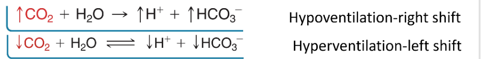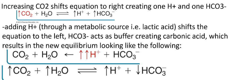 -according to law of mass action, any change in amount of CO2, HCO3- or H in solution causes reaction to shift until new equilibrium is reached