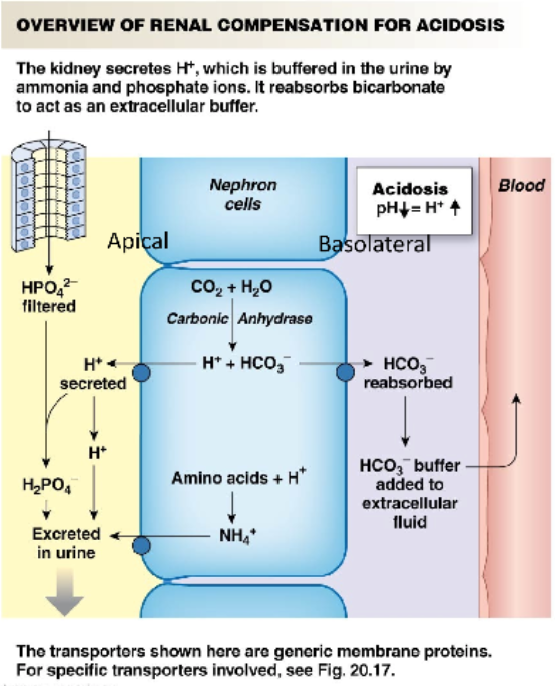 -in general, during acidosis, excess H is buffered by ammonia within tubule cells or enters lumen and is buffered by phosphate ions