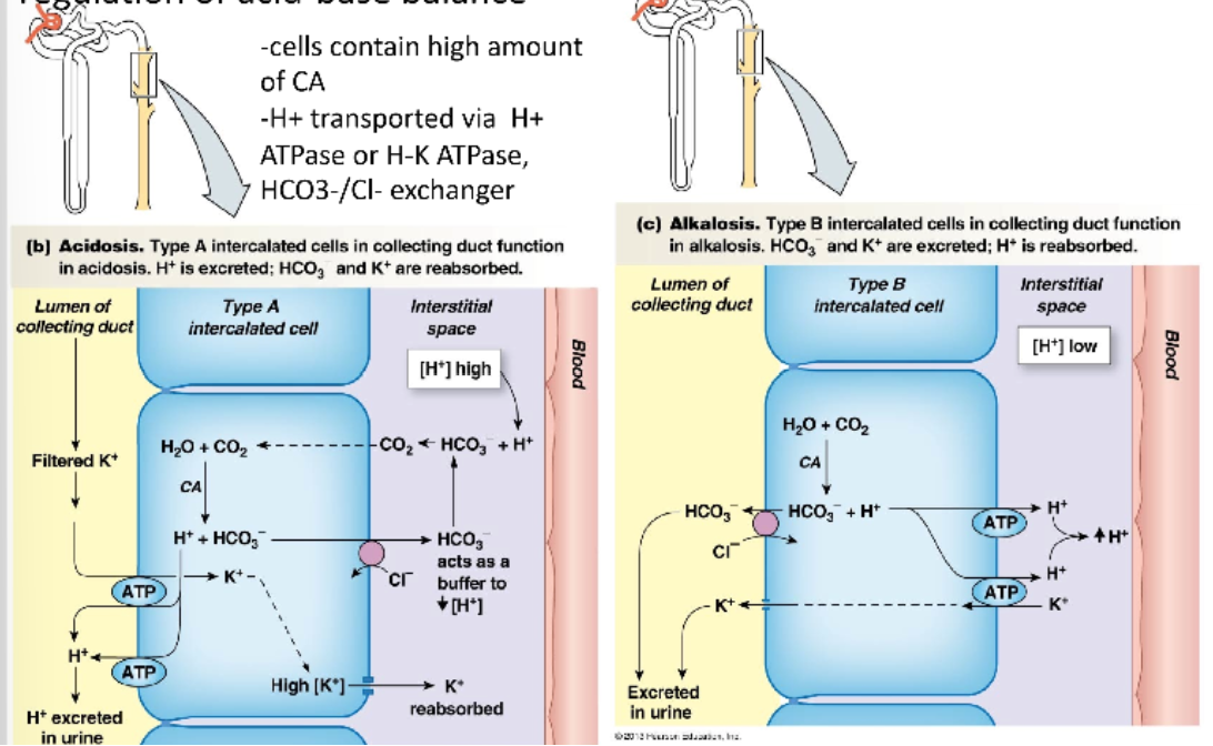acidosis (Type A): intercalated cells function to increase H secretion and HCO3- reabsorption