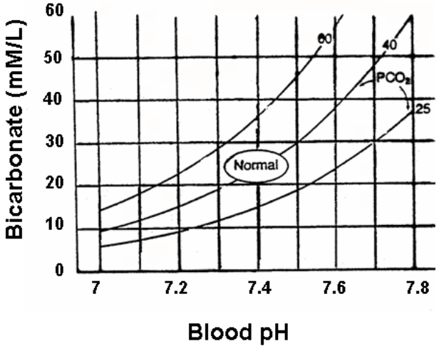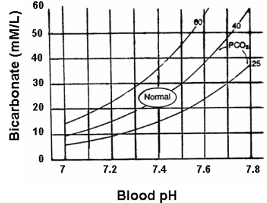 Uncompensated metabolic acidosis = Moving down along a pCO2 diagonal to a lower bicarbonate