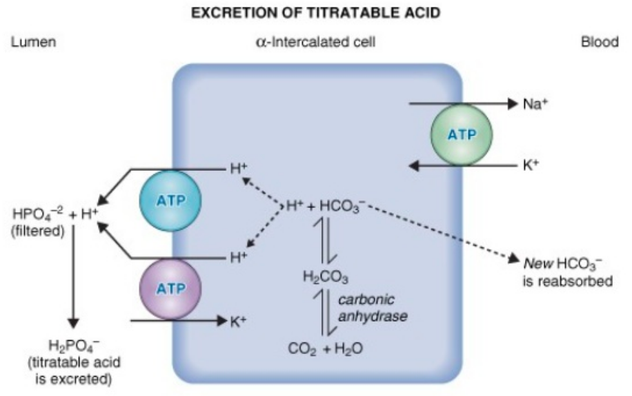 The kidney excretes titratable acid and ammonium to regenerate bicarb.