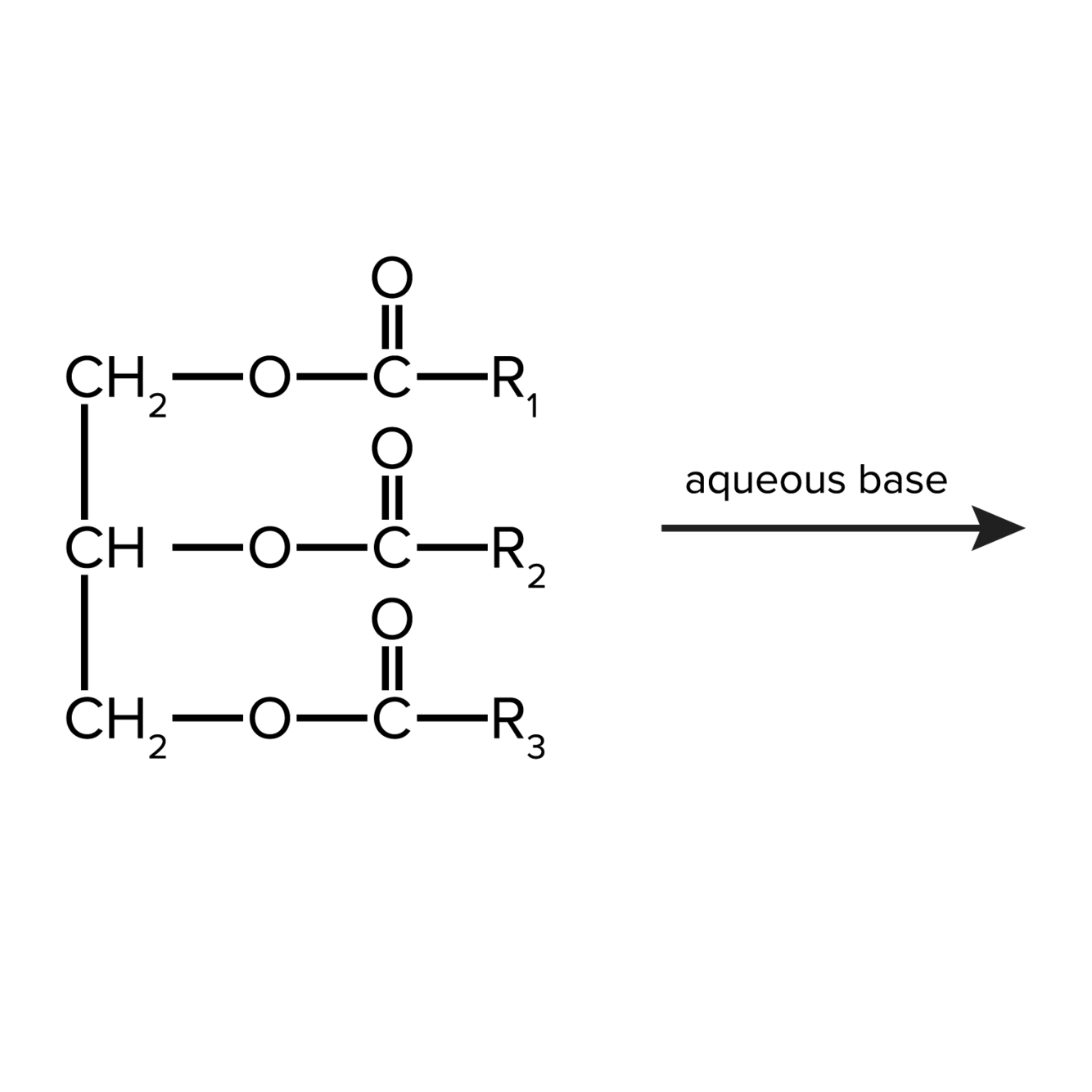 This reaction is a saponification, also known as a hydrolysis of fats or triglycerides. Three hydroxide ions from the basic solution act as nucleophiles, attacking the carbonyl carbons and allowing the backbone to leave as an alcohol.