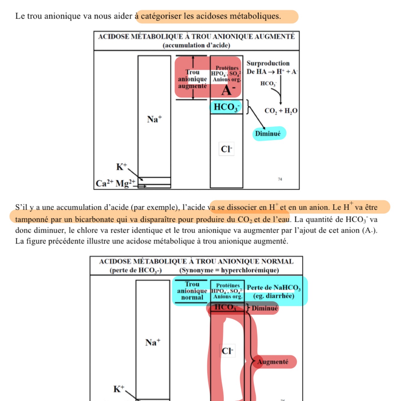Accumulation d’acide, les H + sont tamponnés par le HCO3- qui en tamponnant, se retrouve moins présent sous sa forme d’anion. Le trou anionique augmente par la diminution des HCO3- et par la présence de la base conjuguée (A-) de l’acide quelconque HA qu’on retrouve en trop grande quantité et que le HCO3 a tamponné