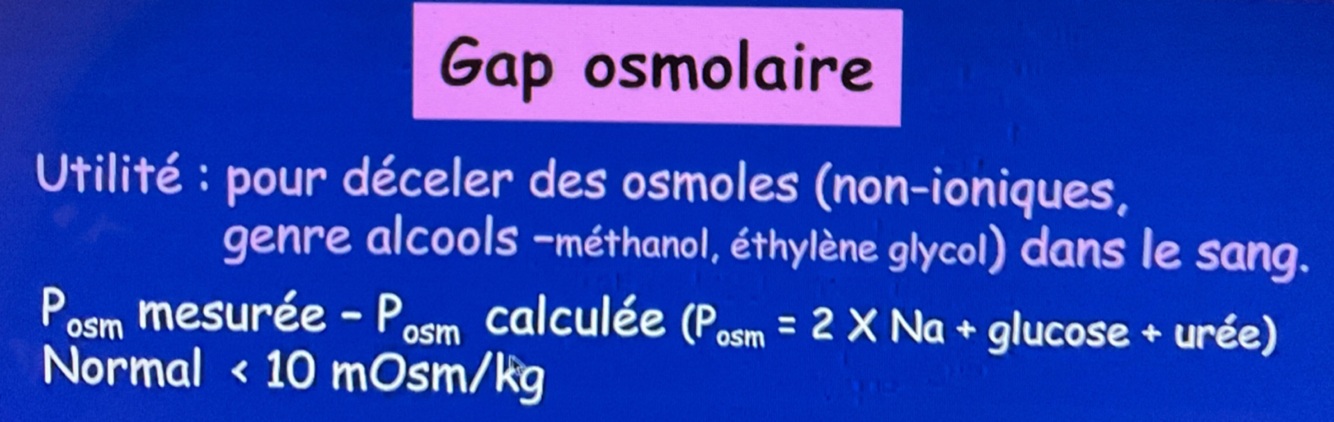 C’est la différence entre l’osmolalité plasmatique calculée et l’osmolalité plasmatique mesurée, permettant de déceler la présence d’osmoses non ioniques dans le sang