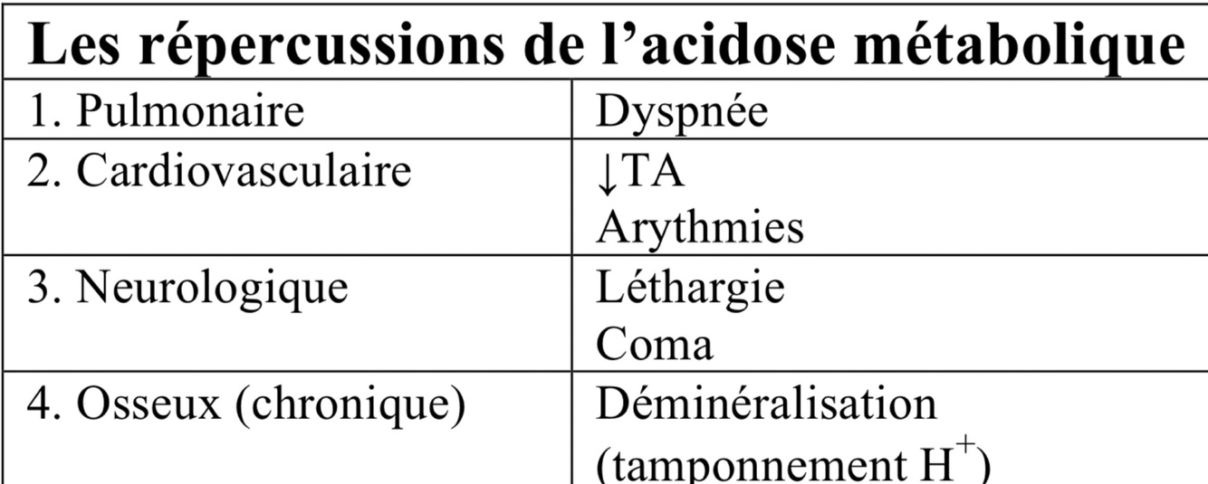 Quelles sont les 4 répercussions de l’acidose métabo.