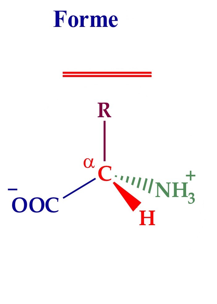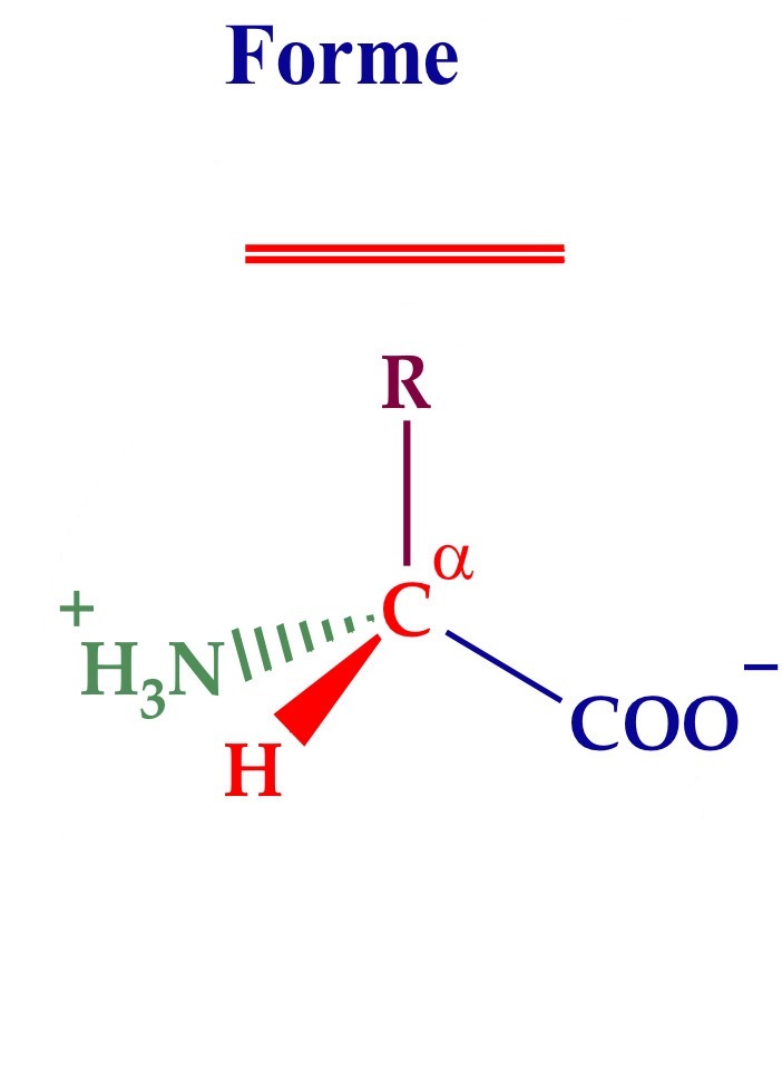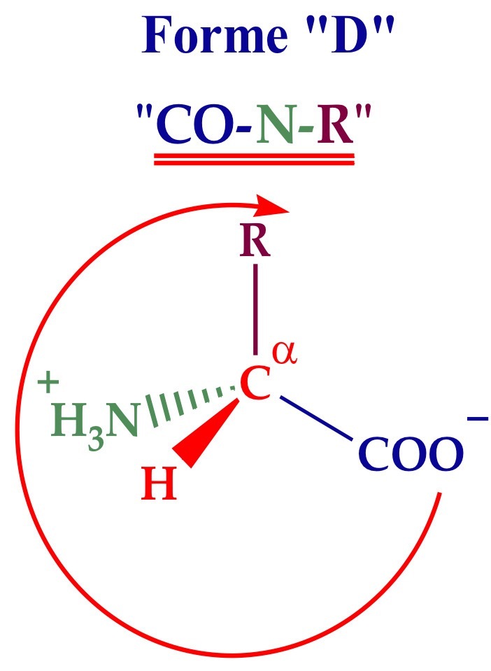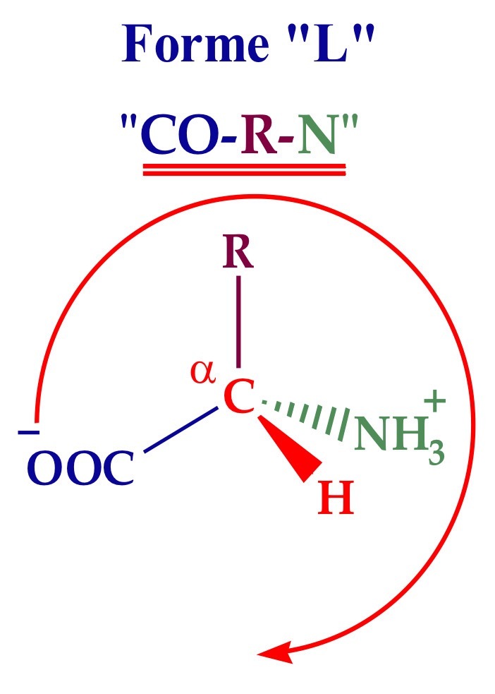 On place l’atome d’hydrogène vers nous (devant) et on regarde quel est la suite d’atome à partir du COO-, dans le sens des aiguilles d’une montre. Si cela donne COO-, R, NH3+ (“CORN”) c’est la forme L. Si cela donne COO-, NH3+ (“CONR”) c’est la forme D