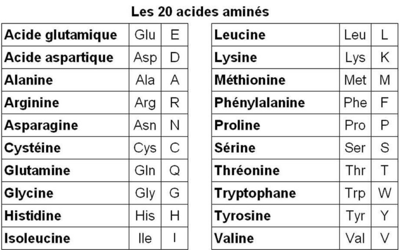 Combien de nomenclatures ont les 20 acides aminés ? Quelle est la différence