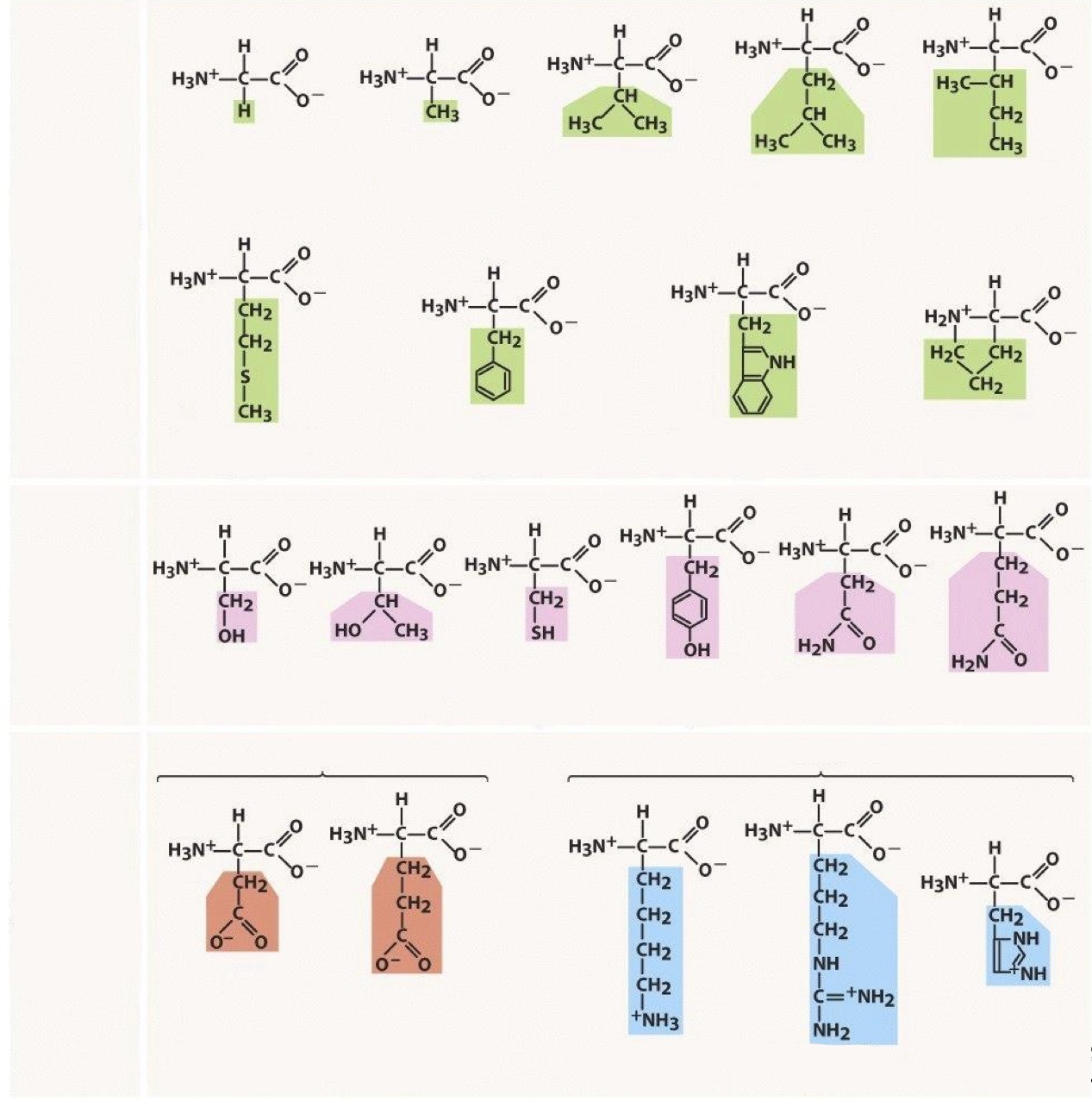Elles peuvent être petites ou grandes, polaires ou non-polaires (= hydrophobe), aliphatiques ou aromatiques