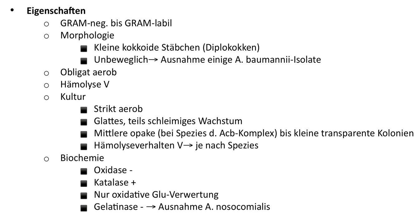 Was sind die wichtigsten Nachweis- Eigenschaften der Acinetobacter ?