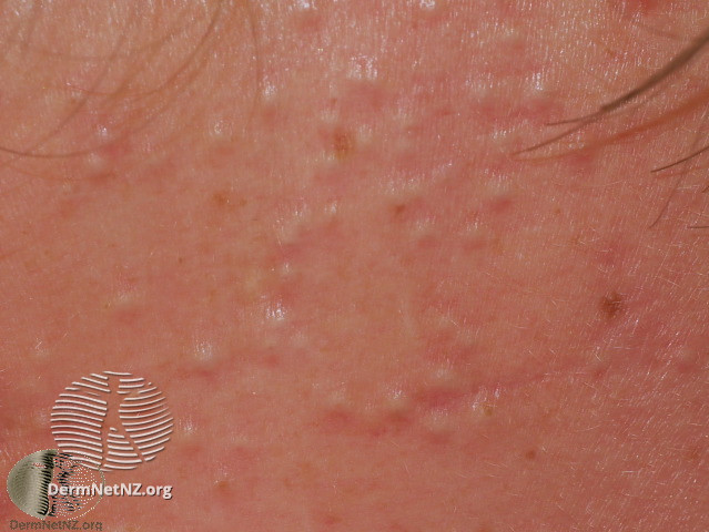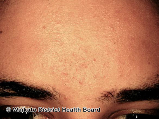 skin-coloured, small bumps (papules) frequently found on the forehead and chin of those with acne. A single lesion is a comedo.