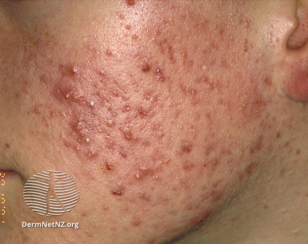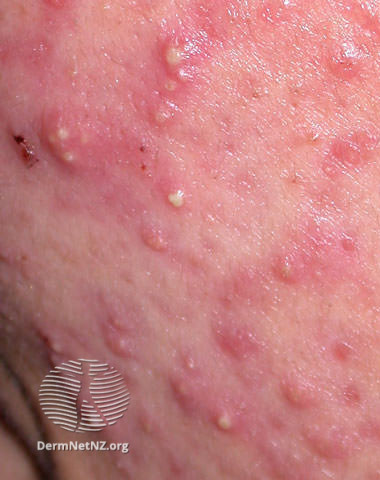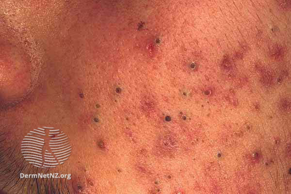 Usually follows rupture of the wall of a closed comedo (white head). It may also arise from normal-appearing skin.