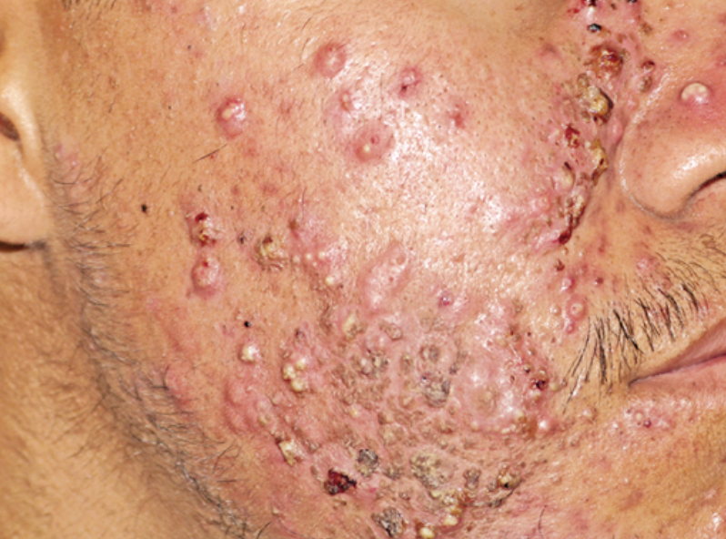 tipo de acne donde las lesiones afectan la cara y el cuello, y están muy extendidas en el tronco, hay comedones dobles, predominio de grandes quistes, nódulos y abscesos y exudación, es una entidad crónica que puede durar hasta los 40 a 50 años de edad