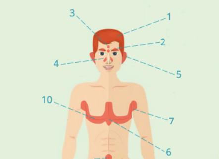 1) Cara (frente/mejilla/nariz/mentón) ± cuello/tórax. Inicia con comedones (cerrados/abiertos/macro) → pápulas, pústulas, nódulos