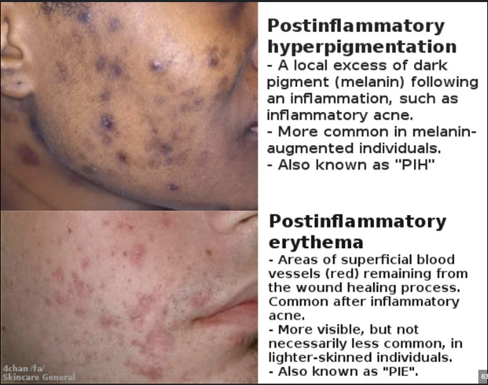 2) Hiperpigmentación post-inflamatoria (PIH) más en piel oscura, meses o permanente