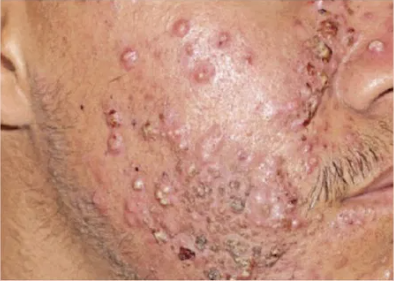 Inicio súbito centrofacial eritema+pápulas+pústulas+nódulos/quistes/fístulas SIN comedones (dato clave).